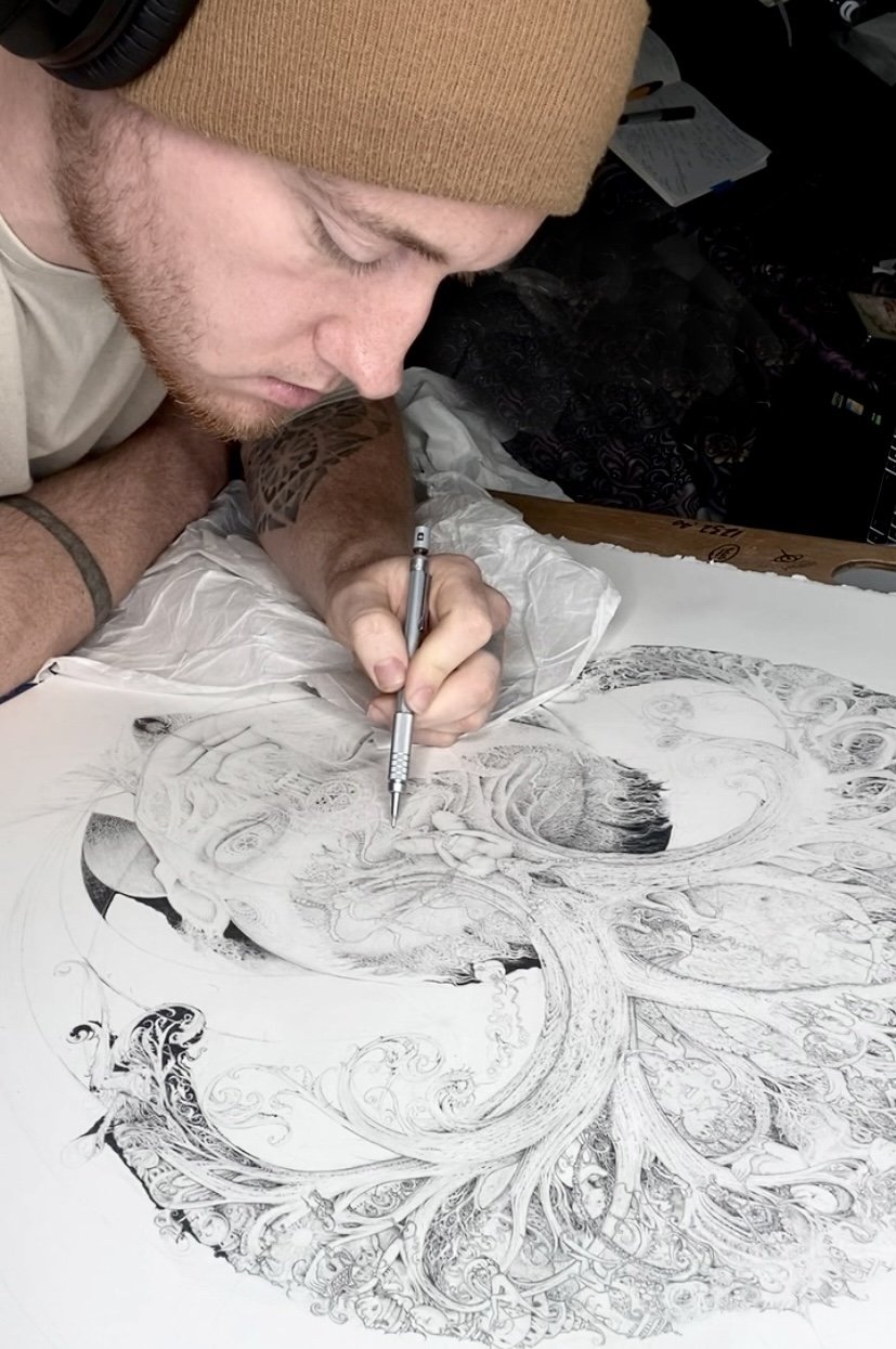 I primarily use paper and fine-tipped mechanical pencils, adding colour with Photoshop, but I also work with pens, watercolours, gouache, and aerosol.